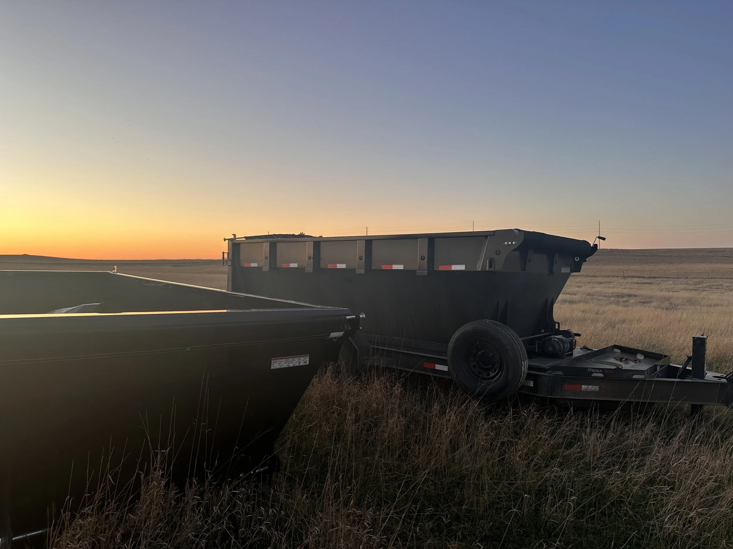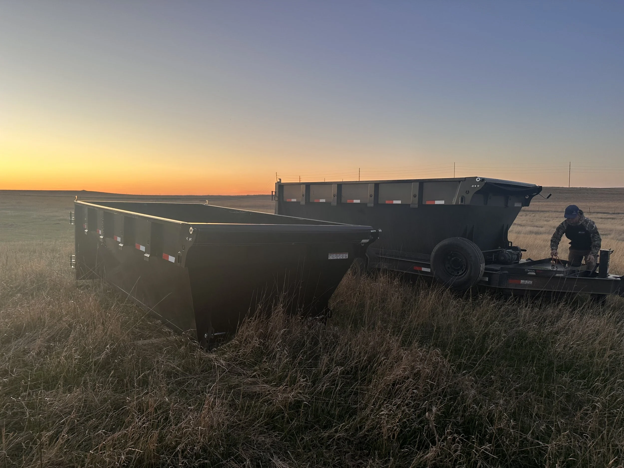 Two black dump trailers in a field at sunset with one person working next to the trailers.
